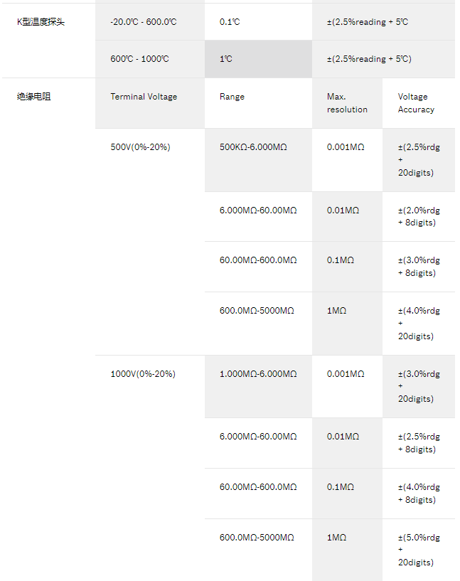 ■ 绝缘测试: 0.001 MΩ 至 5.0 MΩ、绝缘测试自动匹配待测样品量程<br>